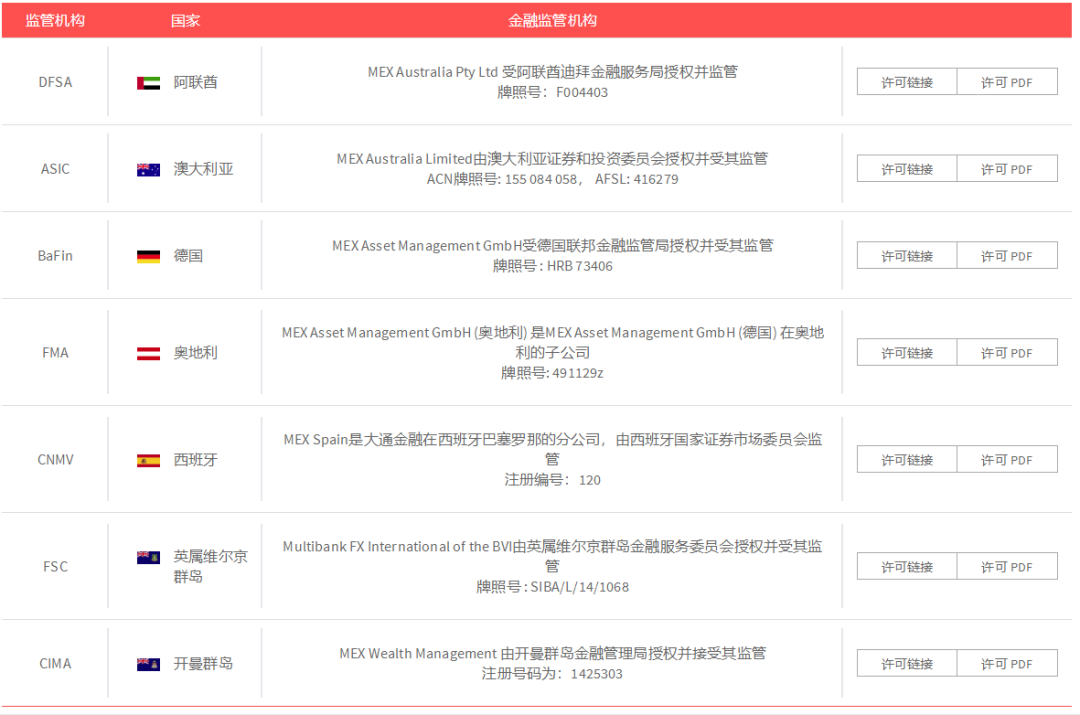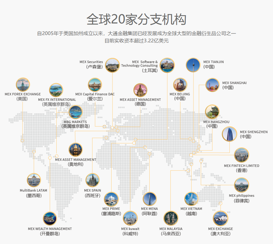 在全球范围内拥有20余家分支机构的大通金融集团,始终按照最高等级的金融服务规章制度来规范自身的业务。目前大通金融拥有7个高含金量监管牌照。包括澳大利亚证券与投资委员会(ASIC)、德国联邦金融监管局(BaFin)、英属维尔京群岛金融服务委员会(FSC)、开曼金融管理局(CIMA)及其他监管机构。集团在悉尼、洛杉矶、维也纳、法兰克福、马德里、塞浦路斯、MEXFintech(香港)、MEX Group Worldwide(香港)、 MEX Asset Management GmbH(奥地利)和胡志明市均设有办公室,且集团正在进一步拓展中。