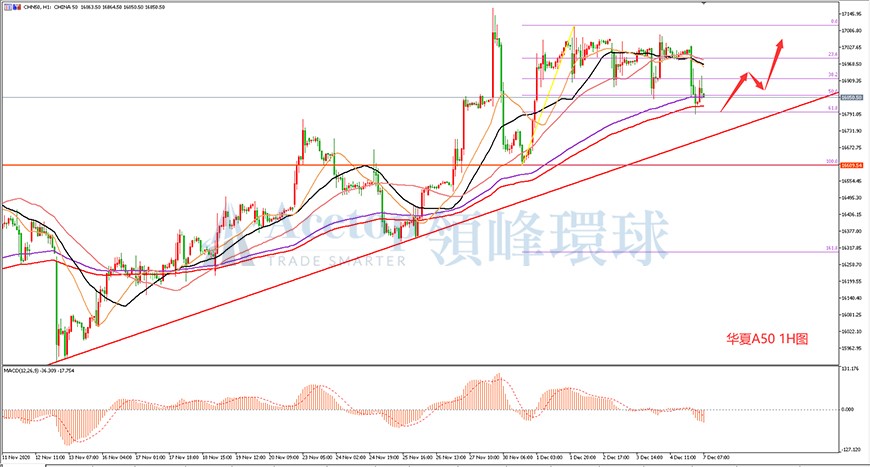 从上图华夏A50指数1H图来看,华夏A50指数今日早间开盘后波动较大,短时间内下跌近240点,截至目前交投于16865附近,由于A股今日已经收盘,料其晚间波动不会太大,但是华夏A50指数趋势仍然看涨,故日内策略可以继续低位埋伏多单。