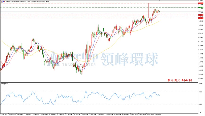 如图所示,在澳元/美元4小时周期中,虽然澳元/美元的上涨依然在保持,但上涨的空间一直在被压缩,极有可能短期内变盘,投资者可耐心等待机会。从趋势上来说,澳元/美元走跌的概率是非常大的!主要因为以今年三月份的低点为起点的上涨被改变,目前诱多已过前高但并不触及极限值,可参考0.7457-0.7487的阻力布局空单。指标上,日线和4小时RSI指标同处于背离之中,也是看跌信号。