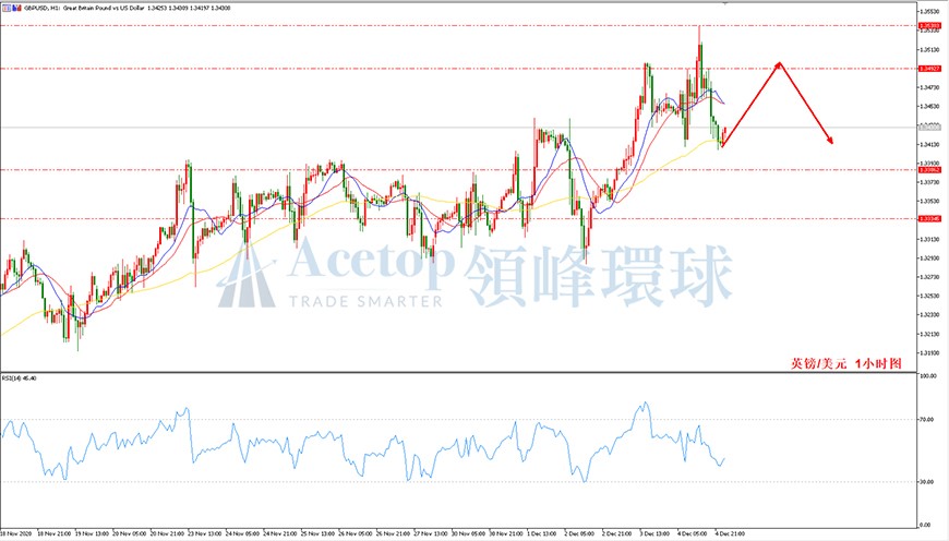 如图所示,在欧元/美元1小时周期中,趋势上已经形成了以当前高点1.2176为起点的折返下跌趋势,故而,日内行情偏向看空为主。1小时节奏阻力点1.2170,若反弹不触及1.2170,欧元/美元将延续其空头趋势;若反弹触及1.2170,诱空后可布局多单。指标上,MA13均线和MA21均线已形成死叉,当前价格也处于均线下方运行,预期在均线压制下走跌的概率较大。参考阻力1.2150、1.2170;参考支撑1.2109、1.2086。