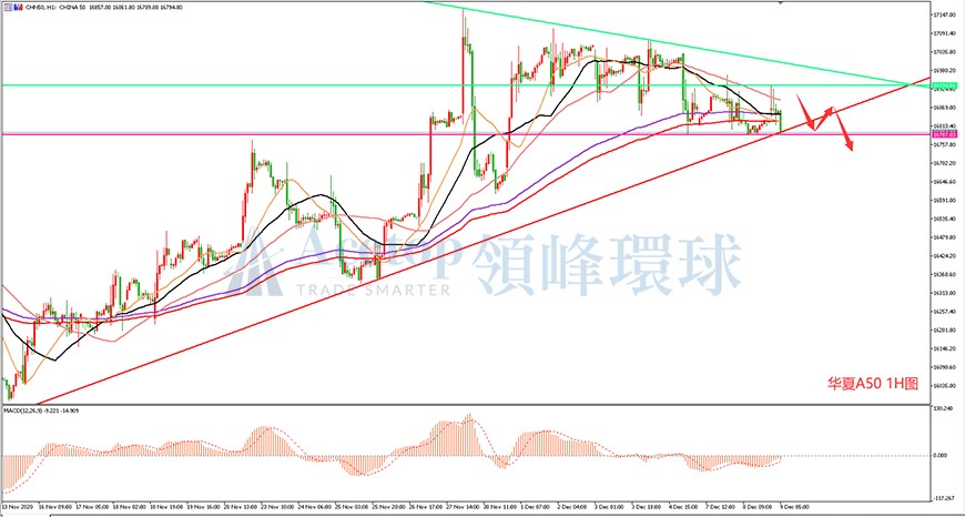 从上图华夏A50指数1H图来看,华夏A50指数今日早间开盘后先冲高,后回落,目前来看有步入空头走势的倾向,由于A股今日已经收盘,料其晚间波动不会太大,但是华夏A50指数最近的高点在不断下移,故日内策略建议以布局空单为主。从均线上来看,华夏A50指数目前位于一小时周期的EMA144均线和EMA169均线下方运行,并且日内高点在MA60均线处受阻,预计该均线的压制作用将继续有效,故日内策略建议在该阻力位附近做空。