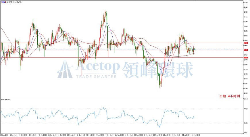 如图所示,在白银4小时周期中,上周五最高反弹到24.10,最低下跌到35.59,上周五文中提到24.56附近的多单第一目标24.00已达到,若有持仓建议出局。日内方向看震荡,预计震荡区间为24.28至23.51,中心轴23.90;操作思路上建议等待价格偏离23.90,距离震荡上下轨附近尝试多空交易。指标上,MA13均线、MA21均线和MA72均线正处于粘合状态之中,为无趋势状态,RSI指标也基本围绕着46徘徊,暂无明确信号。