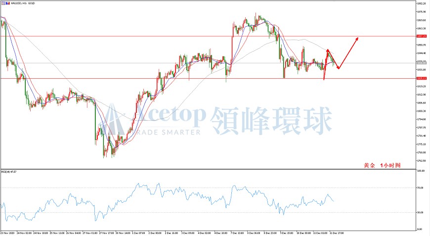 如图所示,在黄金1小时周期中,上周五市场最高价1847,最低价1824,上周五文中提到的1825附近多单第一目标1840已经达到,若有持仓建议出局。日内趋势上重点关注1826的关键位,若不跌破1826,日内趋势看涨为主,上涨目标预计在1850至1857一带;若跌破1826,看至1818至1815支撑附近;从目前走势来看,不破的概率相对较大。指标上,均线指标和RSI指标都无明确的方向信号,建议按照上述分析操作。