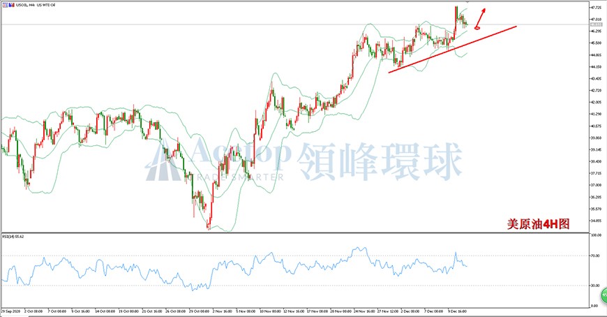 美原油四小时周期图形上来看,目前油价处于上升通道线上方运行,是趋势多头走势;从布林带指标上来看,布林带三轨向上发散,油价在布林带中轨上方运行,预示后市有较高概率延续多头走势;从RSI指标上来看,尚未出现背离,也是多头信号。从日线走势上来看,油价也处于日线布林带中轨上方,未出现背离信号,是多头走势。建议日内投资者采取做多的思路进行操作,多单入场可以参考46.30区间,该区间是四小时布林带中轨,有重要支撑。