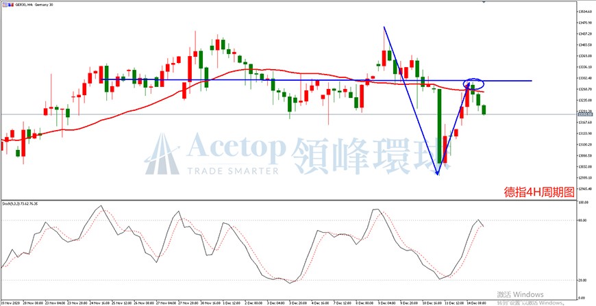德指4小时图来看,德指前期围绕着11340一带的中轴线做上下震荡。但近期行情波动开始加剧,短线德指已经向下方发起攻击。目前德指处于中轴线下方,也受到了28日均线的有效压制,下方Stoch技术指标即将形成死叉并向下发散,预计后期回调概率较大,可以尝试在均线压力附近布局空单。