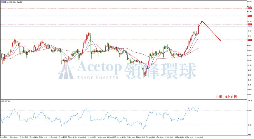如图所示,在白银4小时周期中,以11月30日的低点21.88为起点的上涨趋势已经形成,但需要说的是第一次市场回调的低点23.51却是上涨过程中的一个隐患位置,后市再次跌破23.51的概率仍然偏大。目前,白银在上涨的过程中将遇到26.72、27.50一带的阻力,日内建议在此阻力附近尝试布局空单。指标上,RSI已经在70上方的超买区域,支持看空观点。