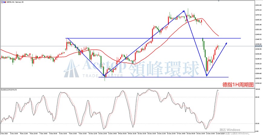 德指1小时图来看,德指近期波动幅度开始加剧。目前指数所处位置上方压力位为13460。下方支撑位为13050附近。短期指数处于均线下方,根据时间与空间的推演,预计短期均线会与上方压力位重合。此时指数也将回到压力位附近。下方Stoch技术指标也在那时候形成死叉,建议投资者在压力位附近布局空单。