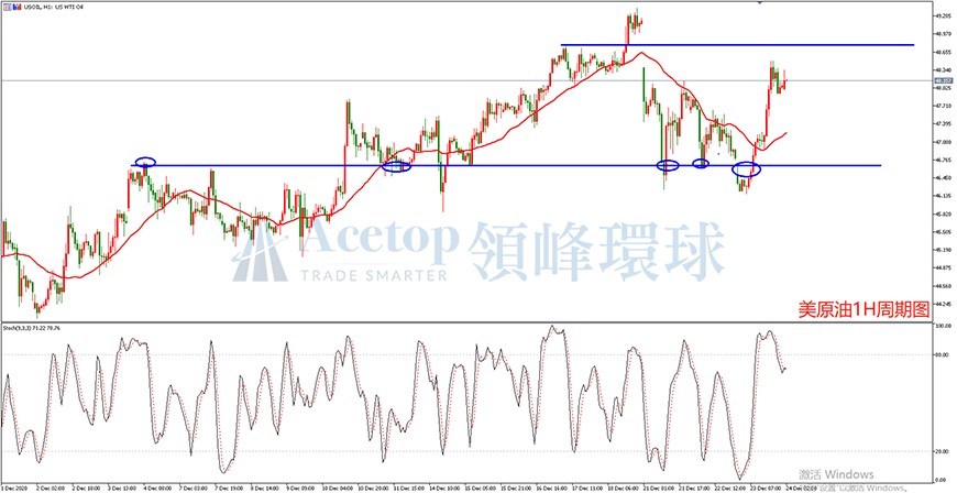 美原油一小时周期结构图来看,油价在前期关键支撑位46.50美元附近企稳,并且形成了强势的反弹,油价直逼短期压力位48.75美元附近。目前油价已经成功的回到了均线上方,下方Stoch技术指标已经在高位形成死叉,预计短期会稍作调整,甚至回落均线寻找支撑。短期均线支撑位在47.40美元附近,建议投资者在此位置布局多单。