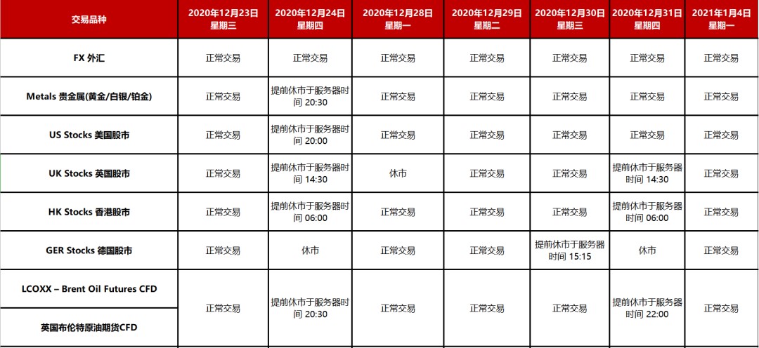 圣诞节及元旦节即将到来,全球市场将于2020年12月25日和2021年1月1日(均为周五)休市。Mex Markets 客户服务部和运营部将于12月25日和1月1日休息, 12月28日恢复办理出金。从12月23日周三开始,市场价格有可能会受到假期情绪及市场流动性不足的影响而出现交投平淡、点差扩大、提前休市的现象。请注意市场情况选择是否进行交易。并请考虑预先规避有可能出现的由点差扩大引起的交易风险。恭祝圣诞及元旦快乐!此致!