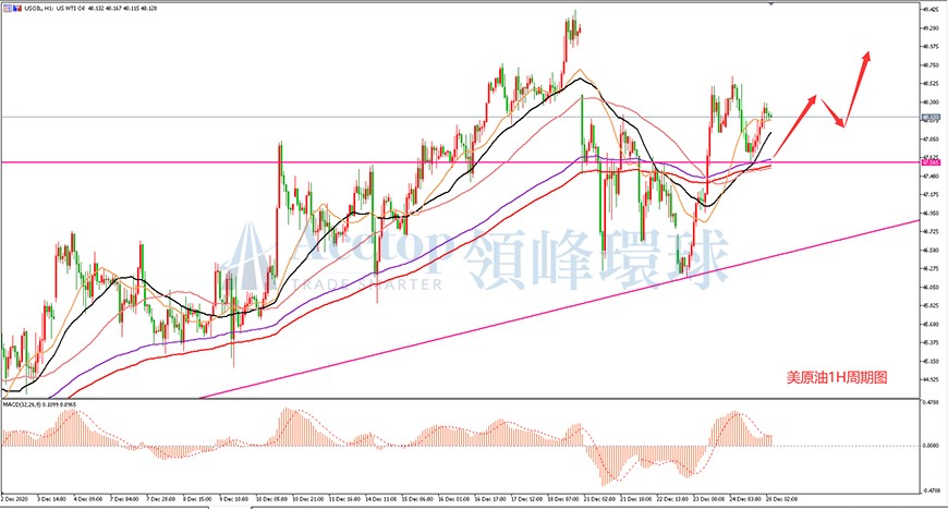 从上图美原油1小时周期图来看,美原油目前整体上波动不大,自从12月23日日线图上收出大阳线后,美原油之后的走势就仅仅只是对当日大涨后的调整,故而后市仍然偏多。从均线上来看,美原油目前已经站上了1小时周期的EMA144均线和EMA169均线,并且最近的回调刚好在这两条均线上企稳,与此同时,MA60均线也为美原油最近的回调提供了支撑,上图中在47.56处为美原油画出了一条水平支撑线,预计该线的支撑作用今日将继续有效,故日内策略建议回调后做多。