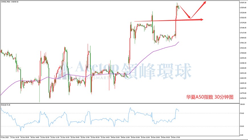 从上图华夏A50指数30分钟图来看,华夏A50指数已经突破了箱体震荡区间,做了小幅回踩以后继续创出新高至17285附近,A50指数整体处于强多行情之中。从均线来看,K线已经站上了60日均线之上,并且远离了60日均线。从RSI指标来看,指标价格快速拉升,进入了超买区域,短期A50或许会面临调整,由于A50指数多周期都是强多头,建议以回落做多为主。