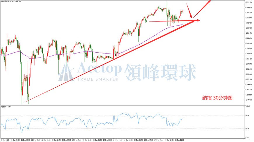 从上图纳斯达克指数30分钟图来看,纳指震荡上行,纳指长期处于上升趋势线之上,创出新高至12920,随后回踩上升趋势线,多个周期都是强多头指向,整体属于强多头行情。从均线上来看,纳指目前站在了60日均线之上,并且远离了60日均线。从RSI来看,指标价格震荡上行,并向着超买区域靠近,极有可能继续创出新高,因此日内的操作建议以回落接多为主。