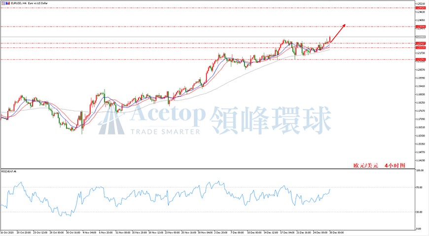 昨天美元指数继续保持了跌势,日内最低下探到了89.81,日内下跌0.35%,今日开盘即跌,截至当前已跌至前期低点89.70附近,2000美元纾困补贴法案未能落实,或加速美元指数的下跌;昨日欧元/美元大幅上涨,日线收涨0.30%,今日开盘后再次拉升,突破前期高点至1.2294,截至当前涨幅已达到0.35%;英镑/美元也不甘落后,昨日上涨0.45%,当前上涨0.25%至1.3531附近。