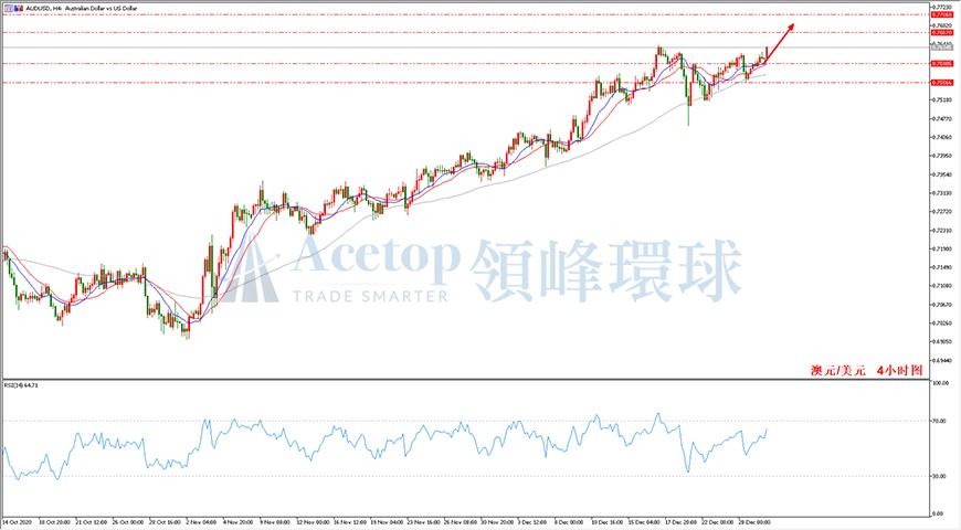 如图所示,在澳元/美元4小时周期中,虽然上方阻力重重但澳元/美元始终都保持缓涨的姿态,这种缓涨的过程或许不会一下突破阻力压制,但通过时间去消化上方阻力却是可行的。日内趋势上依然看涨,预期上涨目标看至0.7667到0.7706区域。指标上,MA13均线、MA21均线和MA72均线呈现多头排列,价格也一直处于均线上方运行,建议在均线附近布局多单,参考买入点0.7600。