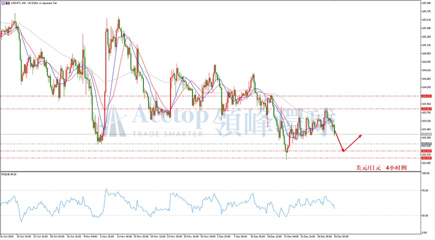 如图所示,在美元/日元4小时周期中,本次反弹最高触及103.89,也正进入近期文中提到的做空点位103.86附近。若在103.86仍有持仓可继续保留看103.03到103.17的目标位。趋势上,日内偏向震荡为主。预期震荡区间为103.03到104.11。由于当前价格已接近103.17到103.03的目标区域,不适合再次追空,投资者可等待价格下跌到此区域后布局多单。指标上,均线始终处于相互交织状态,可关注RSI的变化,若处于超卖区,可尝试在103.15附近布局多单。