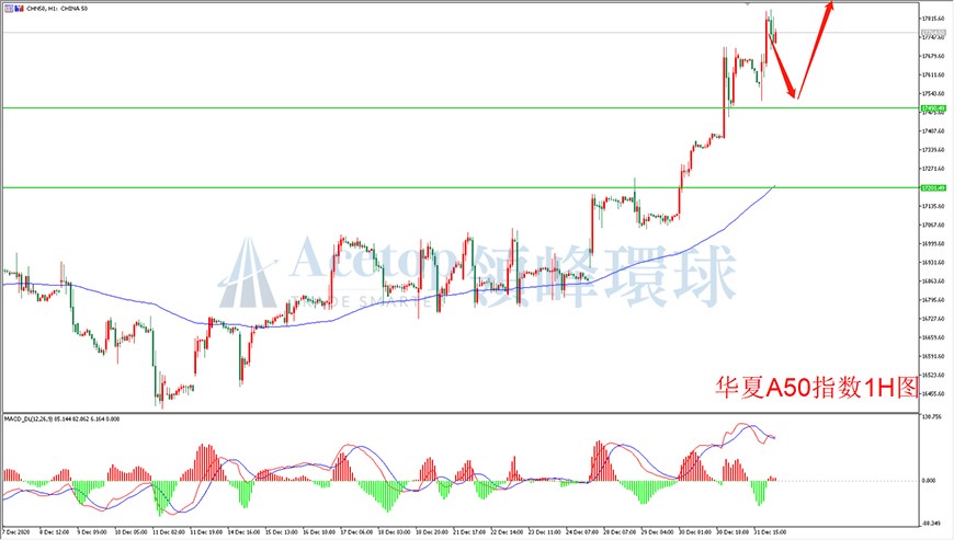 华夏A50指数今日开盘后震荡反弹,在突破17200附近的压力后,开启了一波上行,但目前仍然在加速上行中,继续强势走势。大级别图上,价格对前期的突破位进行回踩,目前回踩有效,下方的17500的支撑有效,后期继续看上行。指标上,4小时MACD动能柱面积逐渐减少,双线在零轴上方,显示价格的强势信号。日内建议支撑位做多,注意控制风险。