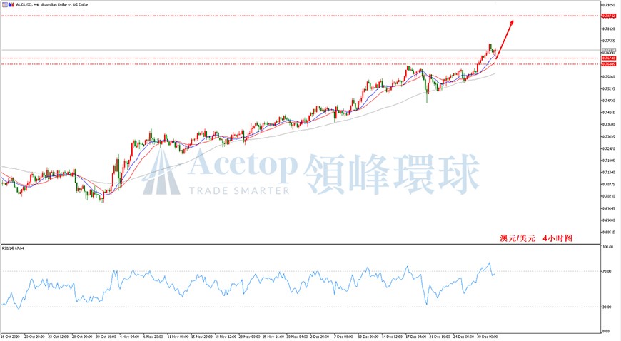 如图所示,在澳元/美元4小时周期中,上周继续收大阳线且已连涨2个月,其强势程度不可小觑。从均线指标上看,澳元/美元仍处于MA13均线、MA21均线和MA72均线之上,且三条均线呈现出多头排列,目前暂无做空信号,投资者依然可以等待价格回调到MA13均线和MA21均线支撑处布局多单。除此之外,投资者也可追踪以0.7461为起点的4小时邻近上涨节奏,日内建议在0.7644至0.7620区间布局多单。