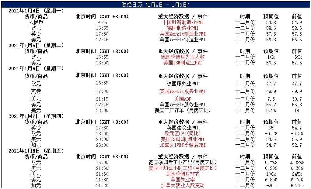 美国方面,上周,美元指数继续震荡下探,主要是因在美国总统特朗普在意外签署抗疫纾困法案后,市场依然押注拜登上台后会推出更多的刺激措施,这使得美元指数持续走弱。本周三,美国将会公布去年12月的ADP就业人数。目前市场预计ADP就业人数或录得7.5万人。另外,本周五美国将公布12月非农就业报告,市场预计美国12月非农就业人数或增加10万人,失业率为6.8%。随着疫情蔓延影响到招聘和裁员,这对劳动力市场造成了比较大的压力,这组数据可能非常颓靡。此外,本周美国还将公布的12月ISM制造业和非制造业指数,目前市场预计与前值比较接近,预计影响较小。 整体来看,在美国财政与货币政策的大放水,以及美债实际收益率为负的背景下,本周预计美元指数仍然偏弱;不过投资者需注意的是,当前美元处于超卖之中,下半周不排除可能会出现技术性反弹。