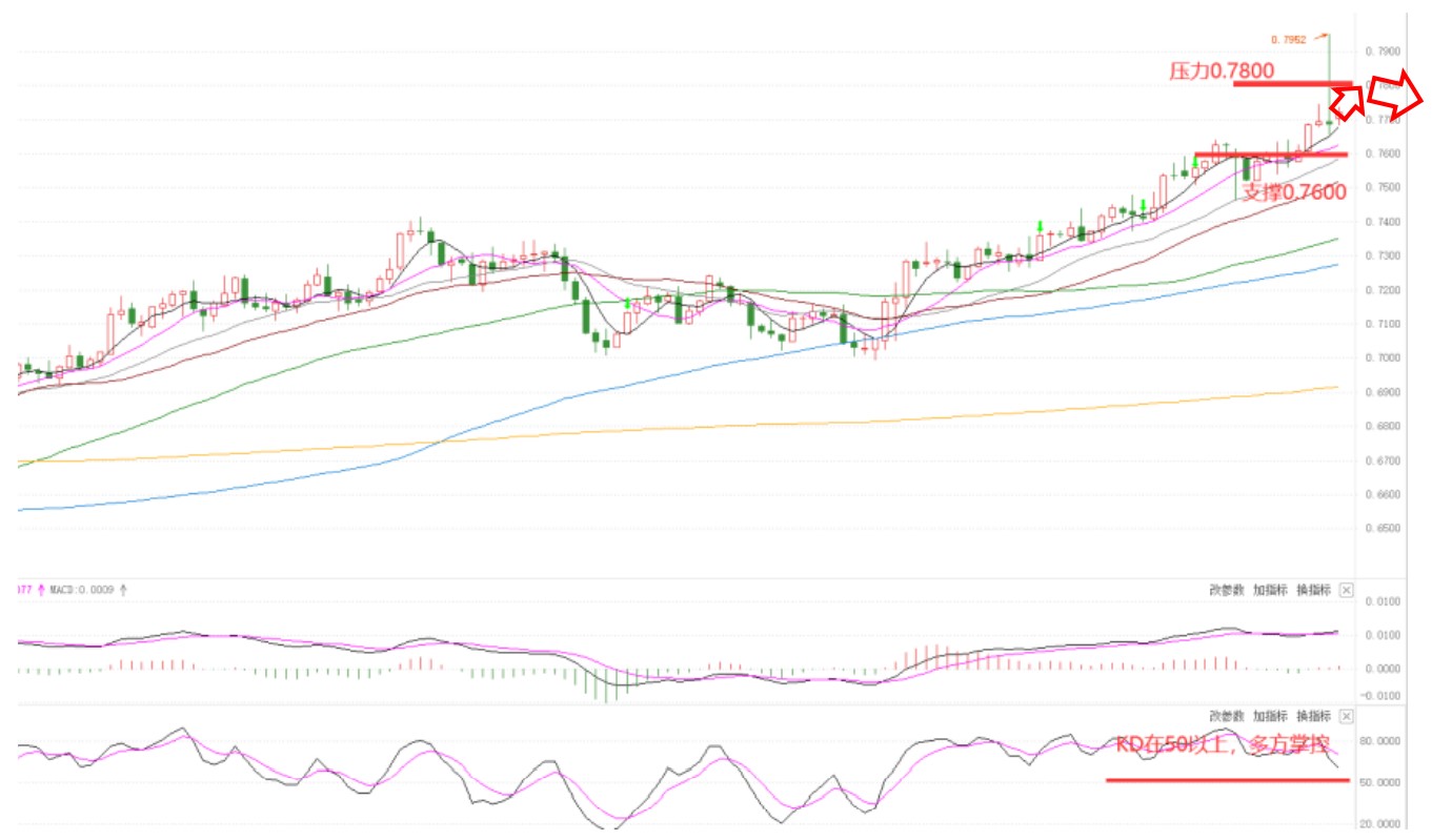 支撑:0.7600,阻力:0.7800