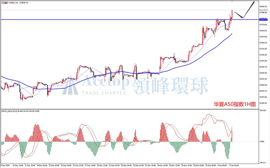 华夏A50指数今日开盘后快速上涨,突破前期高点,再创新高,延续上升趋势,目前仍然在加速上行中。如上图为1小时周期走势图,MA30均线不断上行,K线始终在均线上方,昨天尽管出现了MACD指标的顶背离,但稍作回落后继续上攻,表明趋势极强。技术上,当前最大为周线级别上升趋势,在无周期反转信号信号以前,不能轻言见顶,建议继续尝试做多。