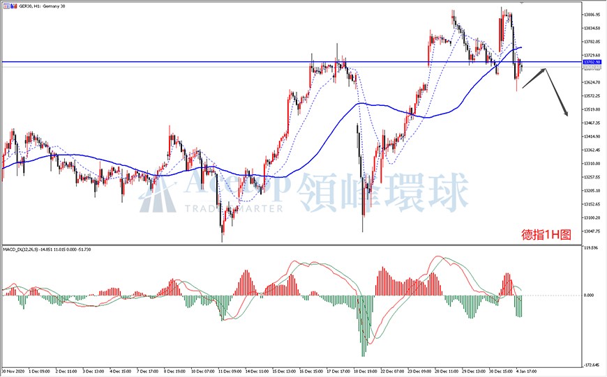 德指开盘继续上行,最高到达13915附近,随后盘中快速下跌,高位有双重顶迹象。如上图为1小时周期,德指昨天创新高后,MACD指标并未同步创出新高,有顶背离信号并快速跌穿图中前期成交密集区的支撑位,随后反弹无法站稳支撑,确认支撑转为压力,建议日内以做空为主,上方的压力在13700的整数关口附近,建议依托此压力位尝试做空。