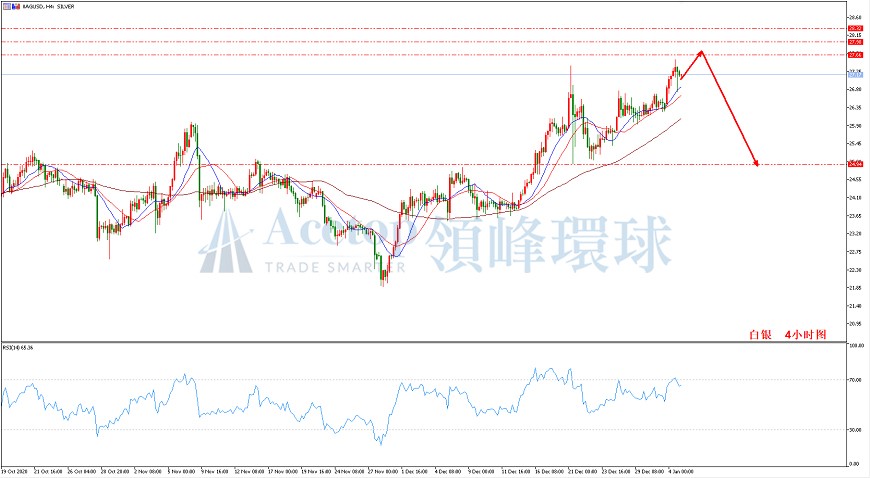 如图所示,在白银4小时周期中,昨日文中提到27.31附近的空单策略第一目标26.85已经达到,若仍有持仓建议先出局。当前思路上重点关注28.32能否突破,在未能突破之前,白银主思路将选择以空为主。原因在于以21.88为起点的4小时上涨已经改变,诱多不到极限转为下跌修复24.94的可能性极大。指标上,RSI两次顶背离,当前仍在70附近徘徊,需警惕27.66附近的阻力压制。