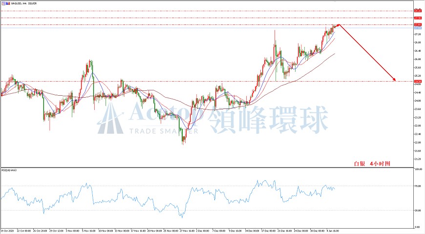 如图所示,在白银4小时周期中,昨日文中提到27.66附近的空单,若有持仓可以保留。方向上,维持看空观点。对于整体趋势,投资者需关注28.32的关键点能否突破。若不能突破28.32的关键位,白银将转为下跌趋势,修复前期24.94的可能性较大;相反,若能突破28.32,后市恐创新高。在未能突破之前,保持看空的观点。指标上,RSI两次背离,存在回撤的可能性较大。