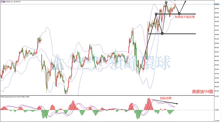 美原油昨日早间开盘后小幅上涨,在涨至51.28附近后受阻回落,随后维持窄幅震荡走势。从1H周期走势结构看,布林线指标上下轨在缩口后有再次开口的迹象,预示着接下来或开启新一轮的趋势性行情。结合MACD指标来看,DIFF线与DEA线在发出背离信号后逐渐向零轴附近靠拢,目前有再次形成金叉的迹象,表明回调行情或已结束,日内操作可在布林线下轨位置50.60附近尝试布局多单,目标看布林线下轨51.20附近,突破后上看52.00附近。