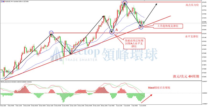 如图所示,在澳元/美元4小时周期中,上升趋势线保持非常良好。前期在突破高点后,短期回踩A点水平支撑位,A点支撑价格为0.7640附近。在企稳后,澳元/美元继续向上突破,再度创出新高后,目前价格回落至上升趋势线附近企稳。此时下方MACD指标绿柱正在缩短,意味着短期空方动能衰竭,价格有短期见底的可能性。鉴于澳元/美元整体趋势向上,目前又在支撑附近,建议投资者在支撑位0.7700附近布局多单,等待市场反弹。