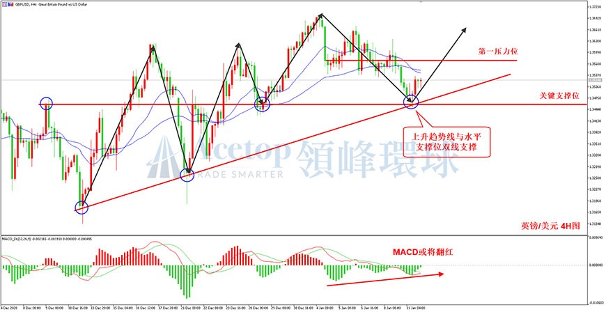如图所示,在英镑/美元4小时周期中,价格前期处于宽幅震荡当中。尽管短期价格有所回落,但是整体运行的低点依然在不断上移,上升趋势依然保持良好。目前英镑/美元处于上升趋势线与水平支撑位的双线支撑位附近,支撑线位于1.3460附近。下方MACD指标绿柱逐渐缩短,预计短期反弹概率较大,建议在支撑位附近布局多单。