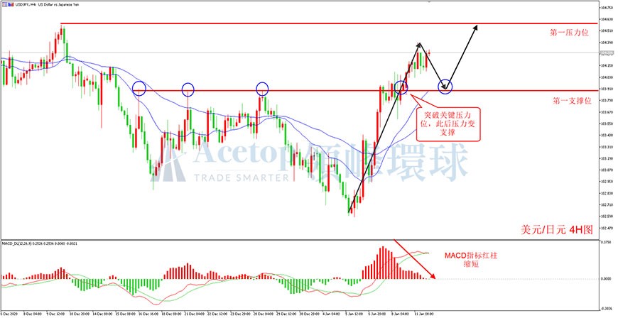 如图所示,在美元/日元4小时周期中,近期价格强势上升,改变前期的下跌趋势。近期美元/日元上升动能较强,直接突破了103.90附近的关键压力位。但下方MACD指标红色动能柱即将翻绿,意味美元/日元上升空间有限,回调概率较大。目前美元/日元属于上升趋势,建议在回调至关键支撑位附近布局多单。