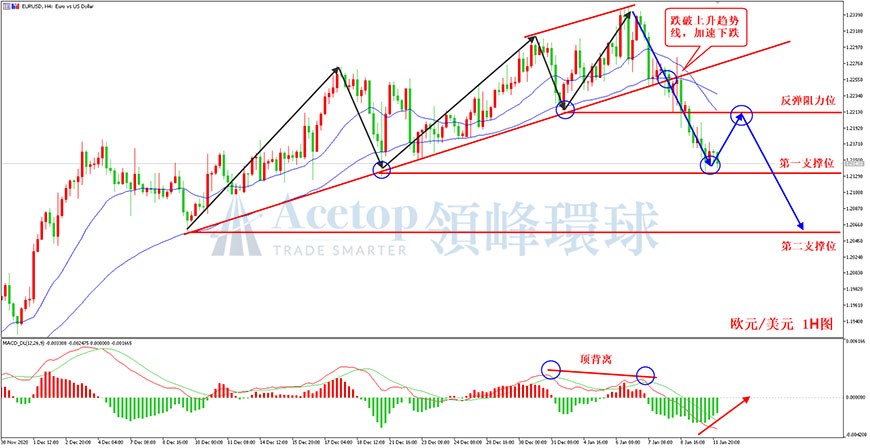 如图所示,在欧元/美元1小时周期中,价格前期在上涨的过程当中,MACD指标在高位形成顶背离的技术形态。此后价格跌破上升趋势线,目前已经逼近第一支撑位附近,第一支撑位在1.2130附近。目前下方MACD指标绿柱正在缩短,预计短期下行空间有限,或将展开反弹。但中期趋势依然偏空,预计反弹至阻力位附近后还将持续下跌,短期反弹阻力位在1.2210附近,建议投资者在阻力位做空。