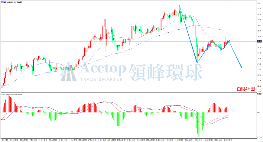白银昨天探底回升,目前再次反弹至前期高点附近。如图白银4小时周期中,白银在接近前期高点位置附近时,开始频繁收出上影线,表明上涨动能不足,上方压力较强。同时,在震荡过中MACD指标的快慢线在零轴下方向零轴靠拢,调整有接近到位的迹象。均线方面,目前MA60也拐头向下,建议看空思路为主。操作上,近期连续反弹受阻的水平线压力较大,空头入场可参考此位置附近。