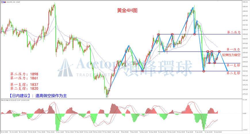 如图所示,在黄金4小时周期中,近期价格在第一支撑1837和第一压力1861之间连续展开震荡,震荡过程中上涨速度快,下跌速度慢,表明上涨动能依然较弱。同时,在震荡过中MACD指标的快慢线在零轴下方向零轴靠拢,调整有接近到位的迹象。均线方面,目前MA30和MA60也拐头向下,偏向看空思路为主。操作上,近期连续反弹受阻的水平线1861附近压力较大,空头入场可参考此位置附近。