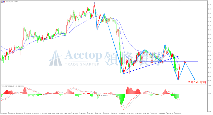 如图所示,在黄金1小时周期中,黄金在跌破了上升趋势线后走出来空头下跌的趋势,快速下跌至1817附近开始了反弹,反弹至1863附近随后在箱体区间内震荡,上周五黄金跌破了箱体震荡区间,创出新低至1802附近继续反弹,目前已经反弹至压力位1830附近,从均线来看,MA20和MA60发散向下,K线远离双均线。从MACD指标来看, DIFF与DEA死叉,空头动能趋强,建议反弹至压力位轻仓做空。