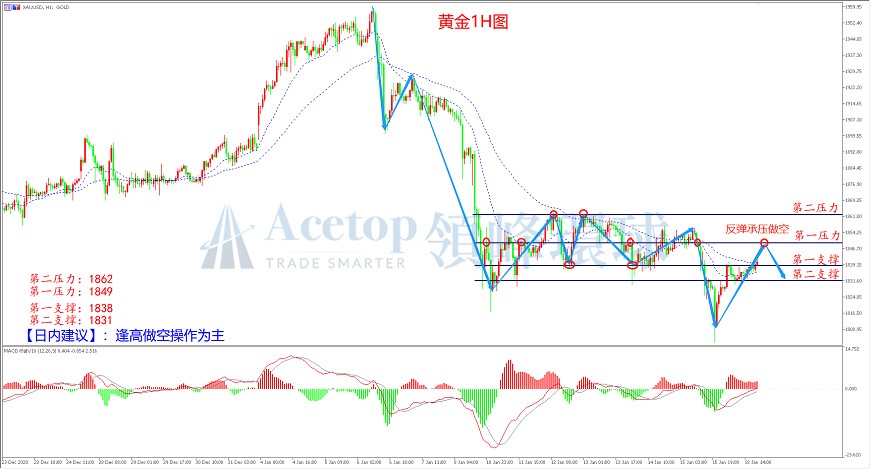 如图所示,在黄金1小时周期中,昨天盘中创出1803附近的新低后开始V型反转,随后在上冲至1838附近的成交密集区之后开始受阻震荡,目前再次上涨。从4小时看,昨天上涨的动能弱于前期下跌动能,行情反转的概率较低,4小时周期建议看空的概率较高。如图1849附近为前期震荡的中轴线,是当前上涨的首要压力位,可考虑反弹至此位附近尝试做空。