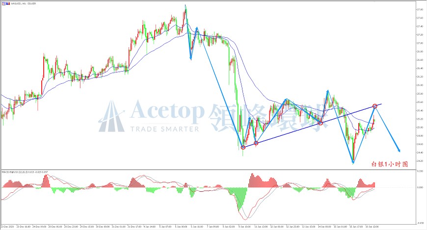 白银昨天探底反弹,再次上冲,4小时周期看,上涨速度弱于下跌速度,MACD依然在零轴下方,反转难度较大,走势偏空。如上图为1小时周期,昨天在下跌至24.11之后,白银到目前为止有两次上涨过程,当前处于第二次上涨过程中,上涨速度弱于第一次上涨,预计上涨持续性较弱,继续下跌的概率较高。图中蓝色划线为前期低点连接形成的压力线,建议白银依托些压力位可轻仓尝试做空为宜。