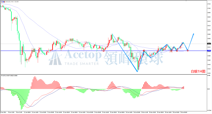 如图所示,在白银1小时周期中,白银跌破了上升趋势线之后,开始了一波单边下跌,创出新低至24.20附近开始反弹。从均线来看,MA20和MA60的方向从下跌开始走横,K线和均线相互交缠,从MACD来看,DIFF和DEA在零轴以上形成了金叉,多头动能柱开始向上行走,预计白银多头继续上行的几率较高,建议投资者回落至支撑位接多操作为主。