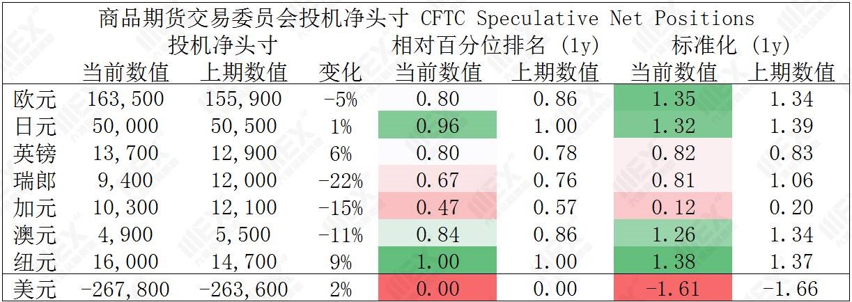 CFTC资金流数据显示,美元空头处于极值,因此,预计短期随着资金流入并支持其回涨,另外,日元、纽元多头也仍处于极值。