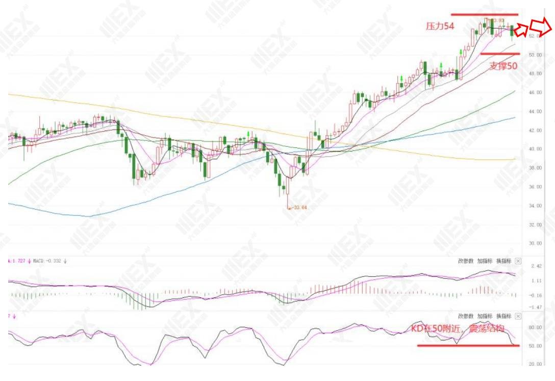 技术面, 按照均线扣抵来看,20日均线将逐渐扣高,因此20日均线并没有什么支撑,可关注30日均线支撑。KD黄金交叉回到50附近,为震荡略微偏多结构。