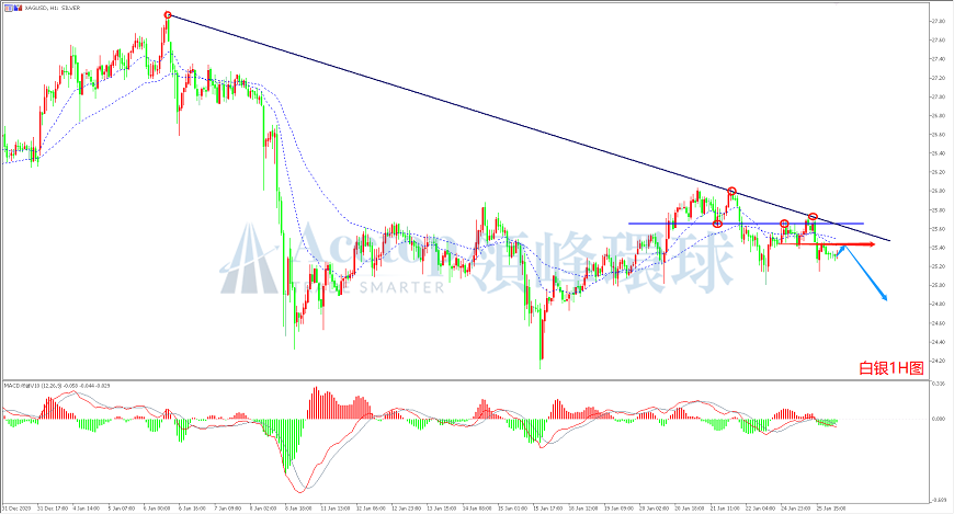 如图所示,在白银1小时周期中,白银昨天在反弹至25.66附近后遇阻回落,确认了上方水平压力线和下跌趋势线的有效,开始下跌。且昨天下跌速度远强于上涨速度,表明下跌动能的加强。指标方面,昨天下跌已经跌穿1小时周期的MA20和MA60均线,且两条均线已经拐头向下,进一步加强了下跌的概率,预计延续下跌的机会较大,因此建议投资者可以空单操作为主,空头入场点可参考均线压力25.46附近。