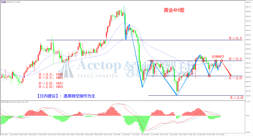黄金昨天冲高回落,上方再度承压。如图为黄金4小时周期,昨天黄金上涨至前期高低点重叠的成交密集区1863附近后再度回落,确认上方压力有效。同时,昨天下跌速度远超于上涨速度,表明下跌动能较强。指标方面,昨天下跌已经跌穿MA20和MA60均线,且两条均线有向下拐头的迹象,进一步加强了下跌的概率,日内预计延续下跌的可能性较大,因此建议投资者以空单操作为主。