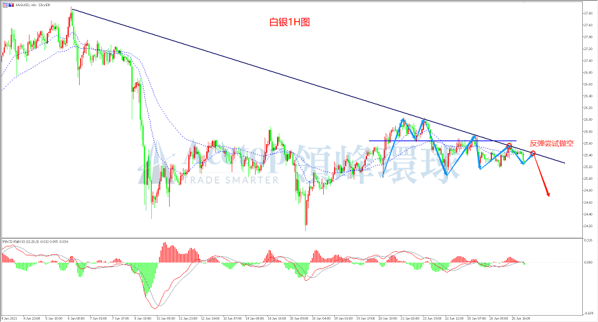 白银昨天全天继续震荡下跌节奏。如图所示,在白银1小时周期中,白银昨天在反弹至25.66附近后遇阻回落,确认了上方水平压力线和下跌趋势线的有效性,并开始下跌。指标方面,昨天已经跌穿1小时周期的MA20和MA60均线,且两条均线已经拐头向下,进一步加强了下跌的概率,预计延续下跌的机会较大,因此建议投资者可以做空操作为主,空头入场点可参考均线和趋势线重叠的压力位25.40附近。