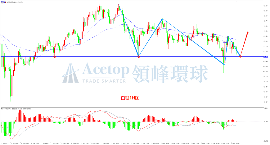 白银昨天亚欧盘震荡下跌,至美盘再度上涨。如图所示,在白银1小时周期中,白银25.00附近此前多次测试均无法突破,支撑较强,昨天盘中一度刺穿,但迅速实现V型反转,表明此处做多动能较强。随后白银再次回落,目前连续回落8根K线仍然没有击穿昨天3根K线的上涨空间,表明下跌动能弱于上涨动能,预计白银再次受支撑的概率较强。操作上,建议以做多操作为主。