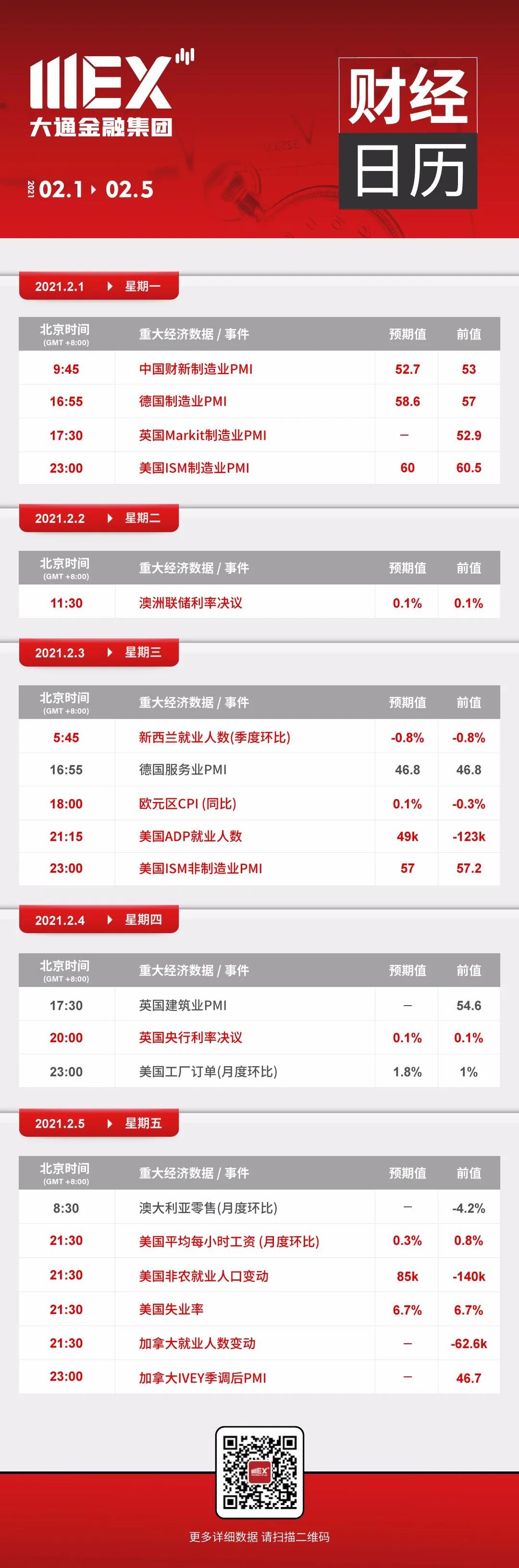 MEXGroup:财经日历 | 前瞻市场,运筹帷幄02.01--02.05