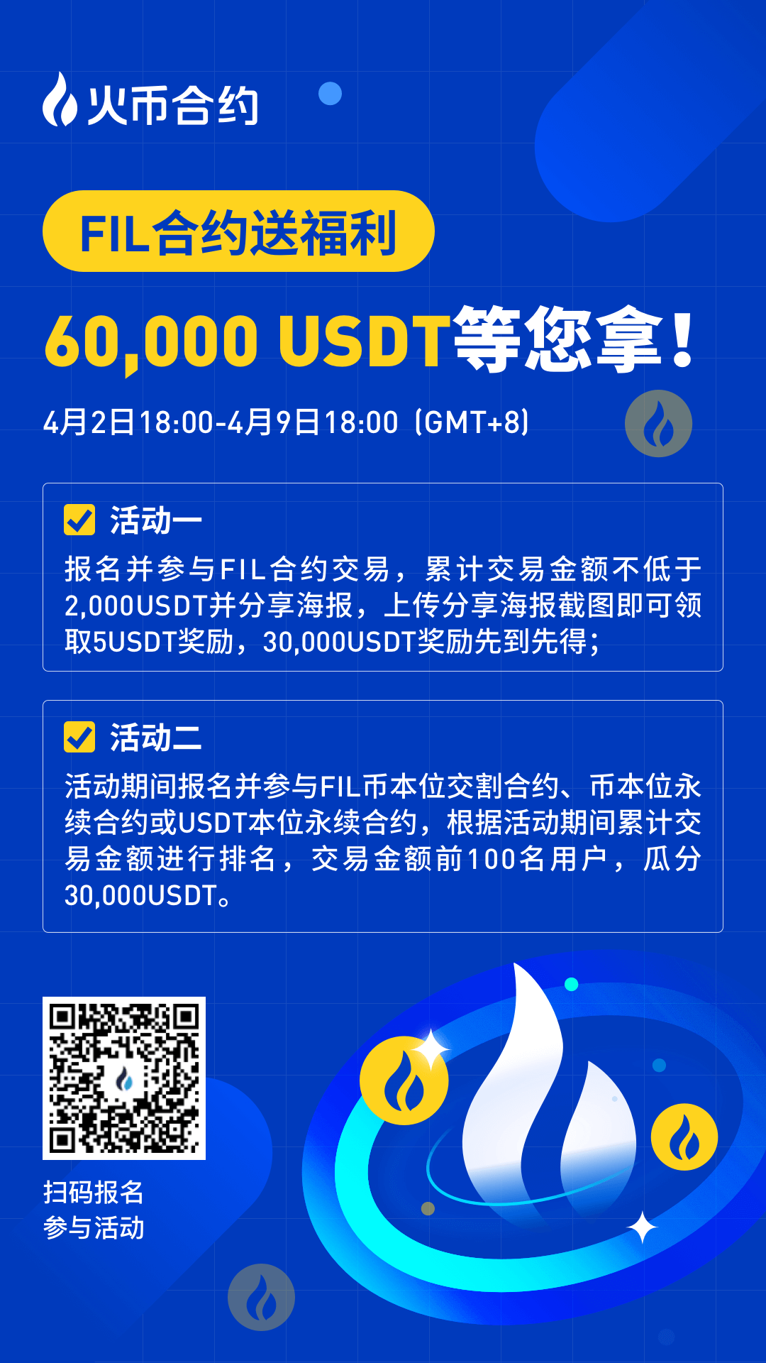 活动期间,用户报名并参与交易FIL币本位交割合约、币本位永续合约或USDT本位永续合约,累计交易金额不低于2,000USDT(USDT:USD=1:1)并分享海报,上传分享海报截图即可领取5USDT奖励,30,000USDT奖励先到先得,领完即止。