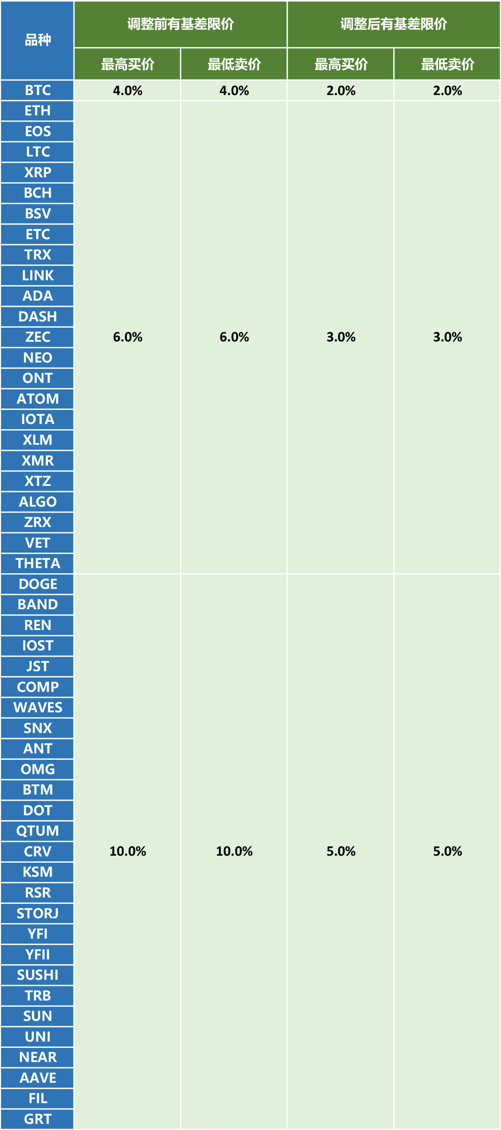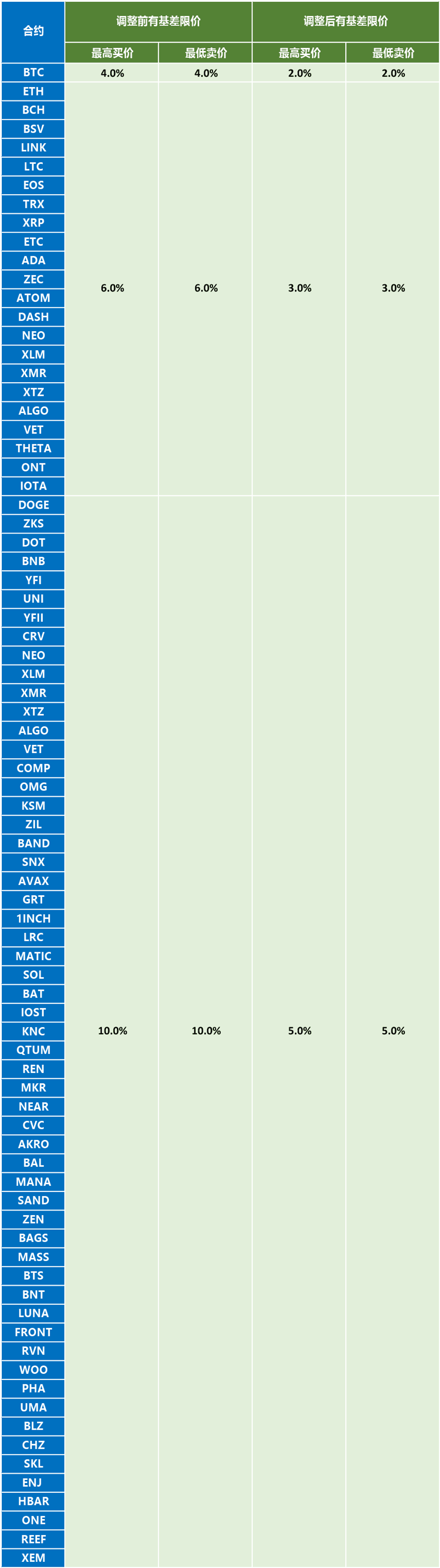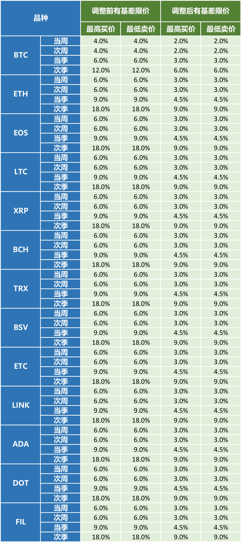 您好!为了给用户提供更好的交易体验,火币合约将于新加坡时间2021年3月24日18:00(GMT 8)调整币本位交割合约、币本位永续合约、USDT本位永续合约的有基差限价的上下限参数,调整的详情如下:
