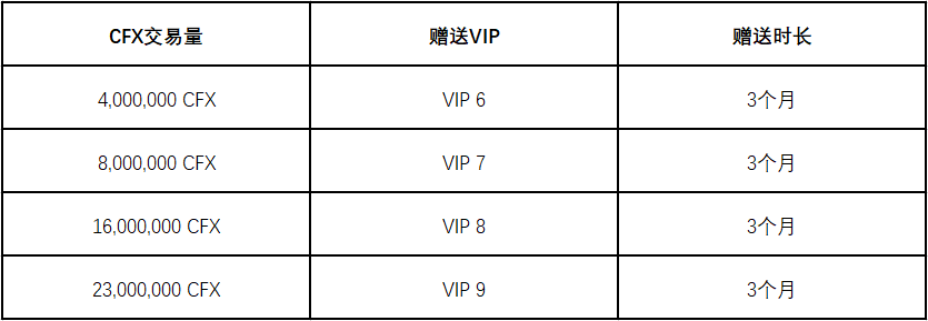 活动期间,API用户交易CFX,交易量大于4,000,000CFX,即可按照下列规则申请VIP费率,享受3个月全平台VIP优惠费率。