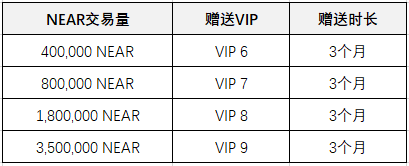 活动期间,API用户交易NEAR,交易量大于400,000 NEAR,即可按照下列规则申请VIP费率,享受3个月全平台VIP优惠费率。