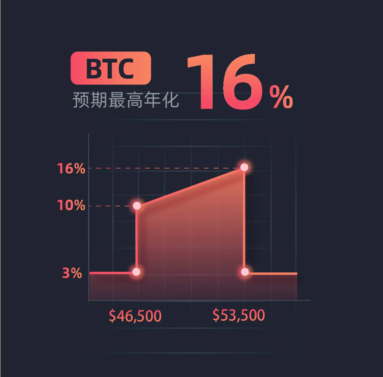 若期间BTC价格曾≤$46,500或≥$53,500,则用户到期将得到3%的年化收益;若期间BTC价格始终处于【$46,500-$53,500】区间,则用户到期将得到最高16%的年化收益(到期结算时BTC的价格越接近$53,500用户的收益就越高)